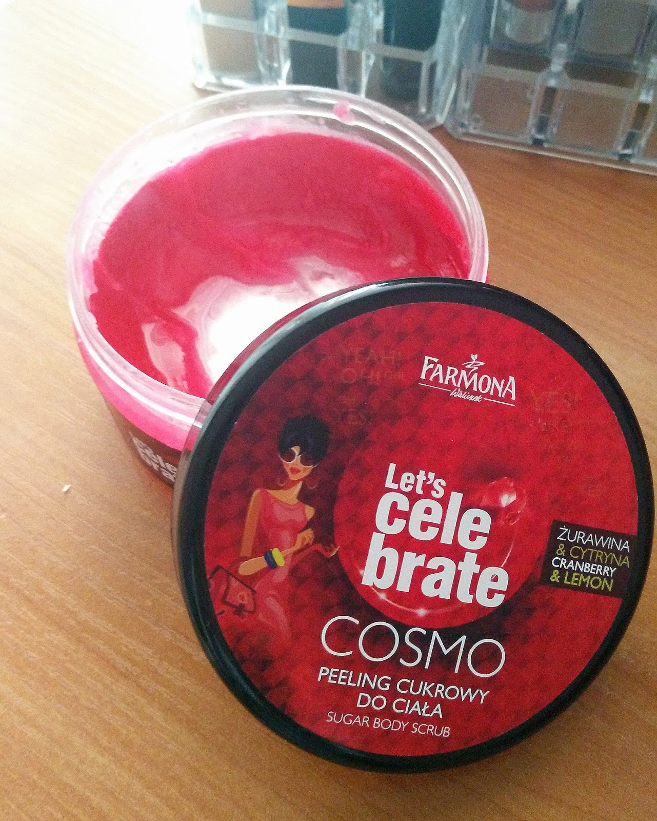 Не бях чувала марката и си помислих, че е някоя измислена, но реших да рискувам. По-късно се поразрових и научих, че Фармона е полска натурална козметика, което ме изненада много приятно. Срещала съм и други техни продукти по стелажите на Елитис, като и те имат същите симпатични опаковки, като на скраба, за който ще си говорим днес. Той всъщност е от серията на марката "Let's celebrate!", която предлага комплексна грижа за тялото, като продуктовият асортимент включва лосиони, масла, скрабове, душ гелове и пяни за вана с аромат на едни от най-известните и любими коктейли - "Космополитън", "Пиня Колада", "Мохито"и "Сънрайз". Всички продукти от серията не съдържат парабени в състава си.